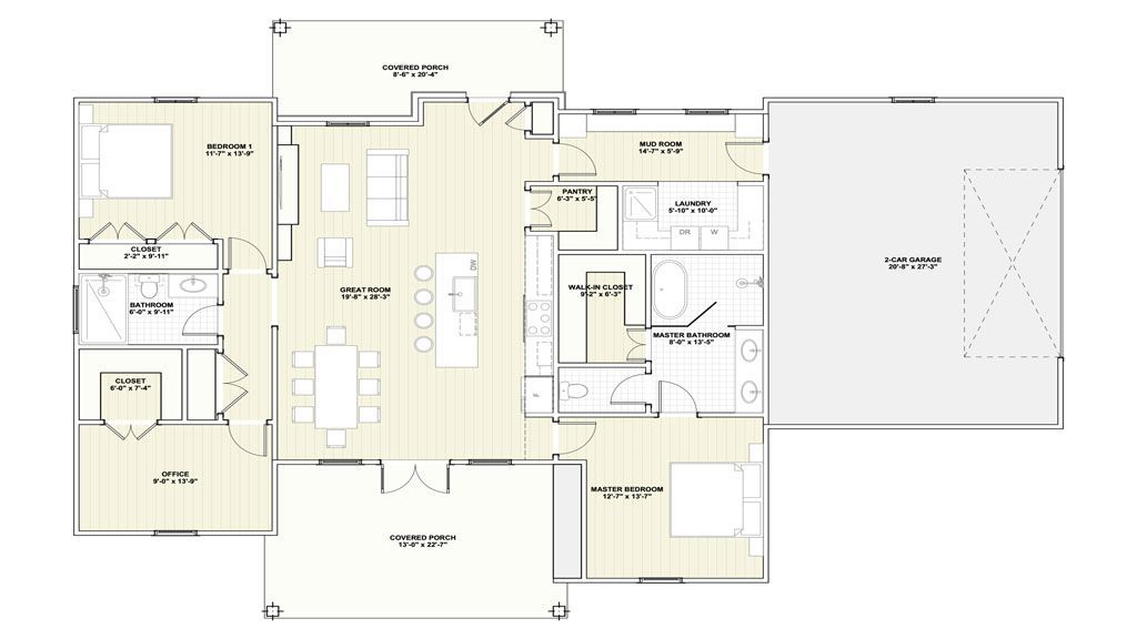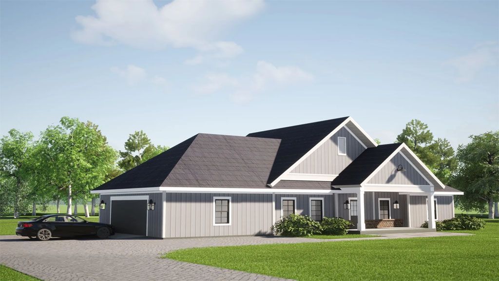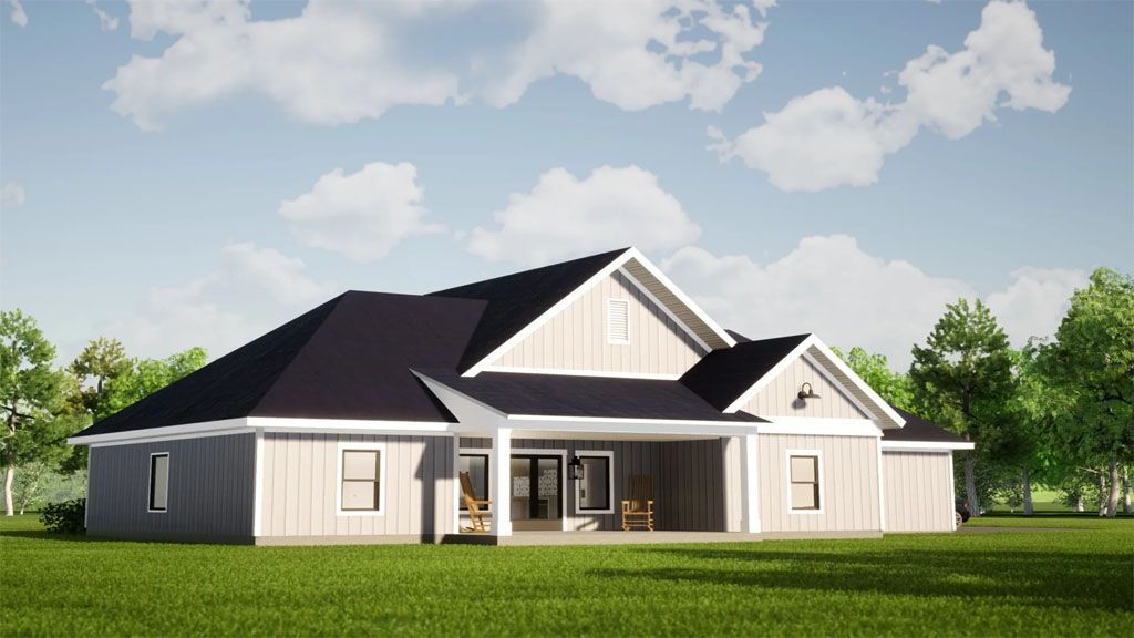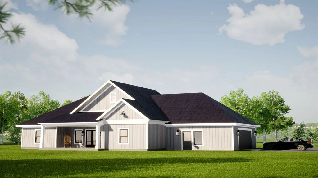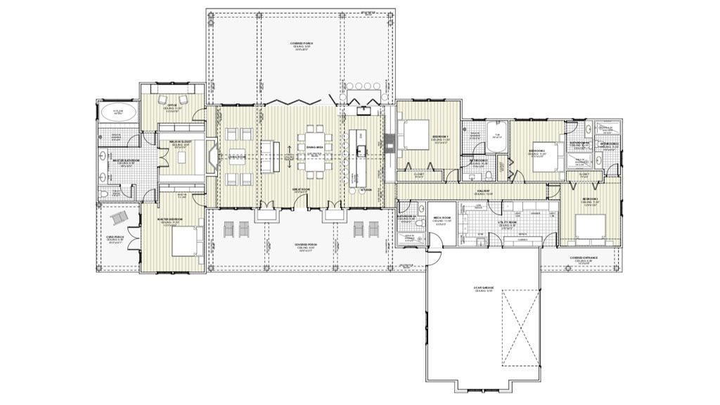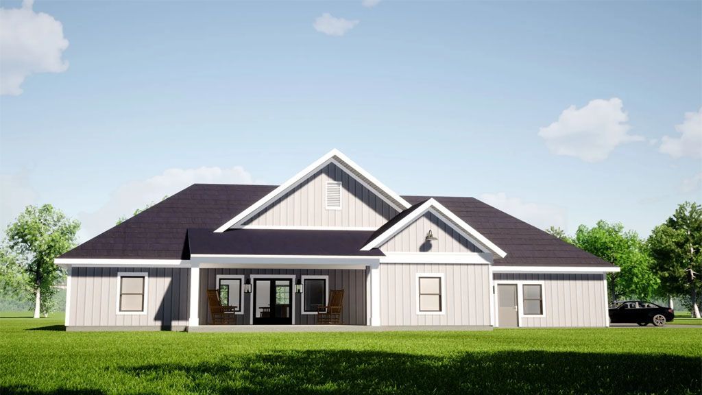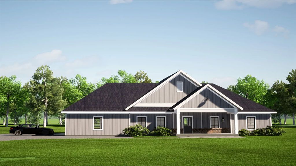 The House shows an extended Front Covered Porch. A door flanked by brick bump-outs that define the Main Entrance. Beyond that door, you get directly into a Great Open Space with the Living Room, Dining Space, and the Kitchen, open to the rear views. Next to the Kitchen, you will find a long hallway leading you to the Secondary Bedrooms, Guest Suite, and the Utility Room.