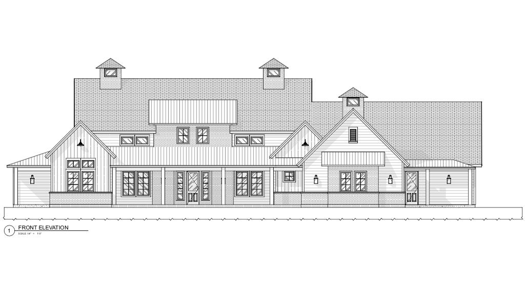On the Exterior, we went with a traditional white Board & Batten. All the framing and doors are black with white casings. It brings accents all around the house. We went with a dark shingle roof that gives that modern and slick appeal to the house. A detailed trim work shows all around the house as accents and remembrance of the traditional Country house that inspired us.