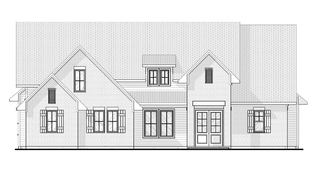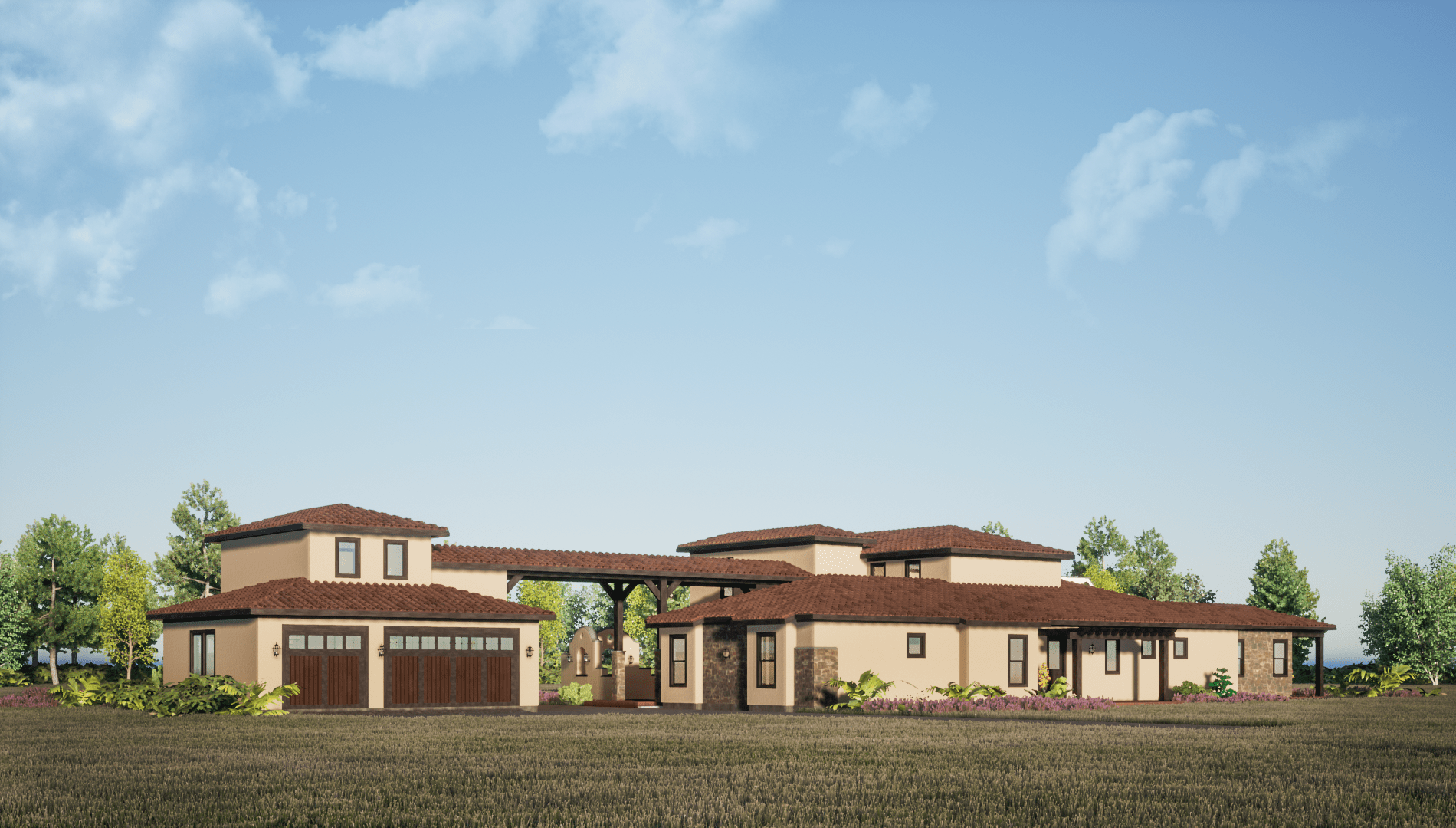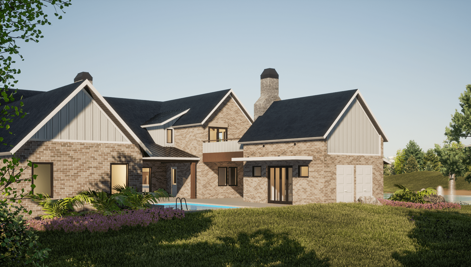 On the front, two gables frame the Main entrance. We also added french doors with sidelights crowned with transoms. Also, to add definition and a modern flair, we placed a hanging pergola covering the front porch.