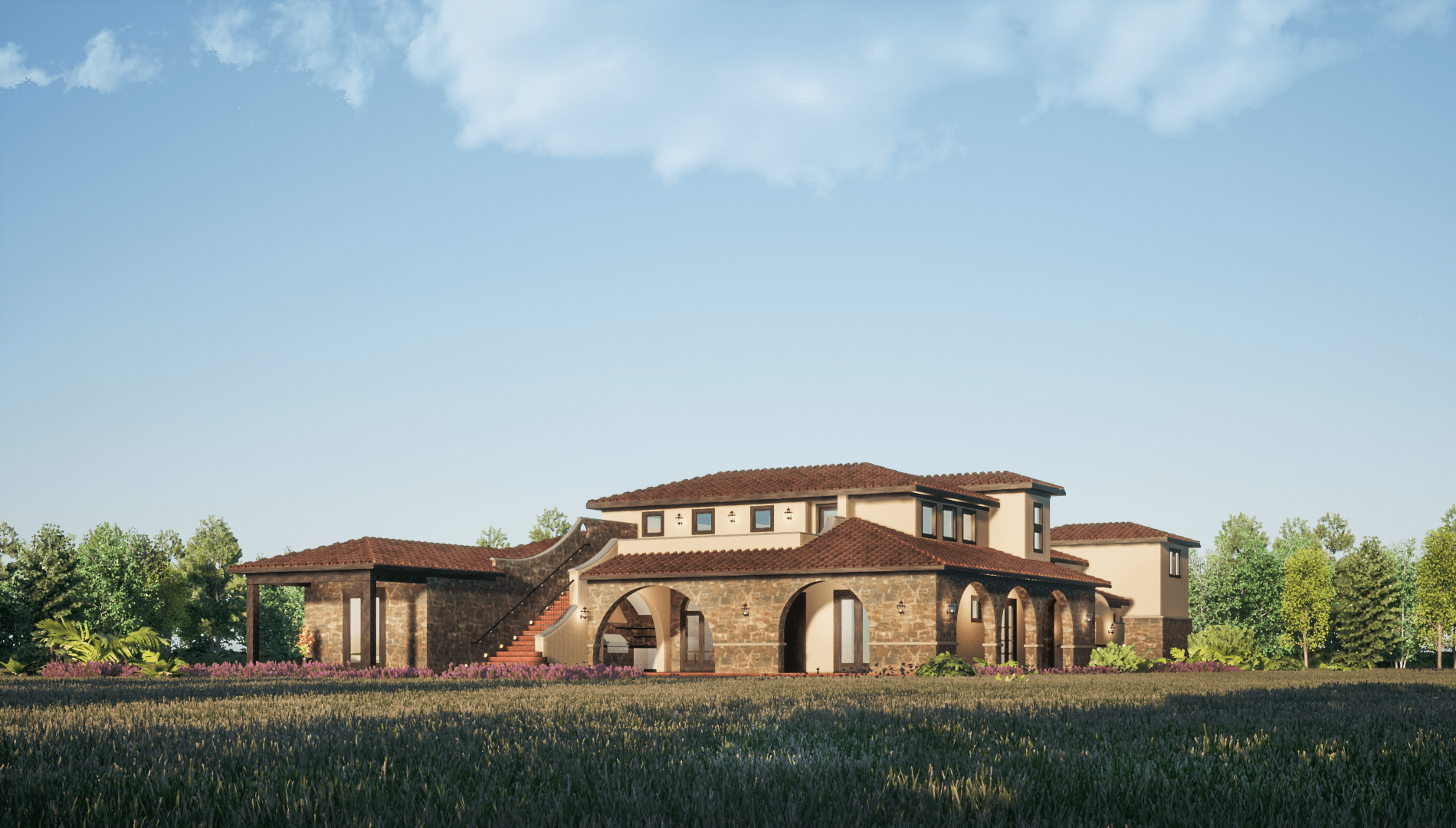 We went with Brick and Stones on dark earth tones on the Exterior. We went with grey metal roofs that give that modern appeal to the house. The angled wing showcases a gallery that runs along the spaces ending up in a Den. The Gallery faces the backyard, where we placed a