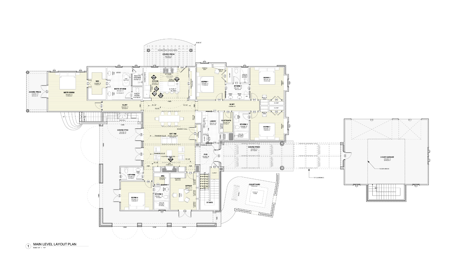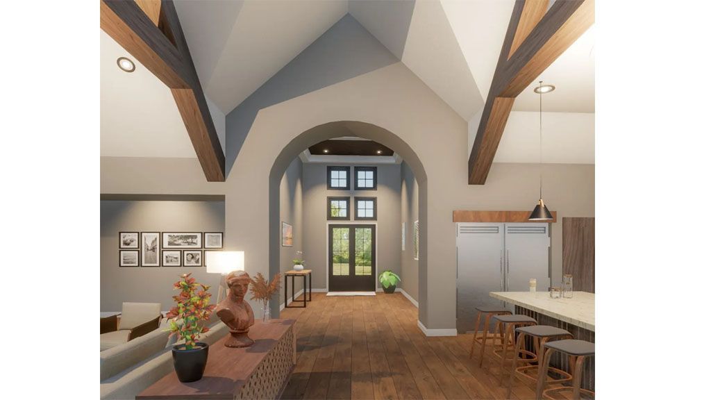 The Main Entrance is crowned by a wood beams gable and framed by stained wood columns. Windows and a half-glassed door give the see-through effect that lets us see the backyard through the great room when standing at the front door. The Foyer is a tall welcoming space with a gorgeous hallway that leads us to the Great Room. Once we get below the grandiose arch, we enjoy the open space. The Great Room contains the Dining Room that faces the front of the house, while the Living Room and the Kitchen faces the patio.