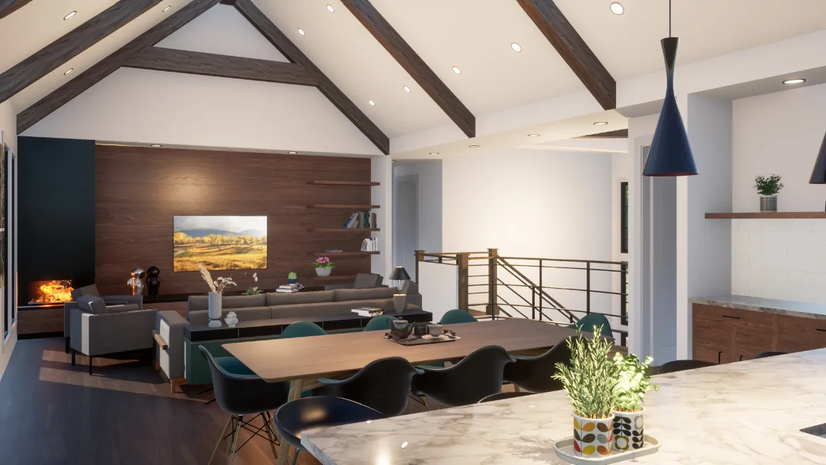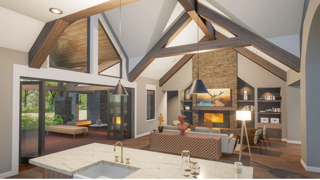 A vertical bump-out emphasizes the main entrance to the house, which is crowned by a shed metal roof and framed by stained wood columns. The Great Room opens to the Covered Patio through gorgeous accordion doors that allow us to connect the indoor and outdoor spaces. That space is large enough to accommodate furniture options. We also have an outdoor sitting area with an outdoor chimney. Outdoor cooking facilities are also featured there.