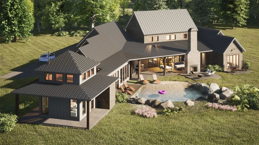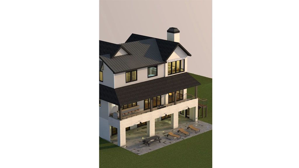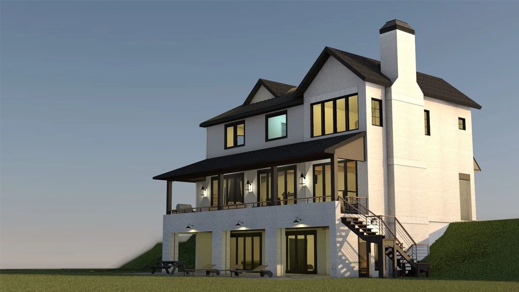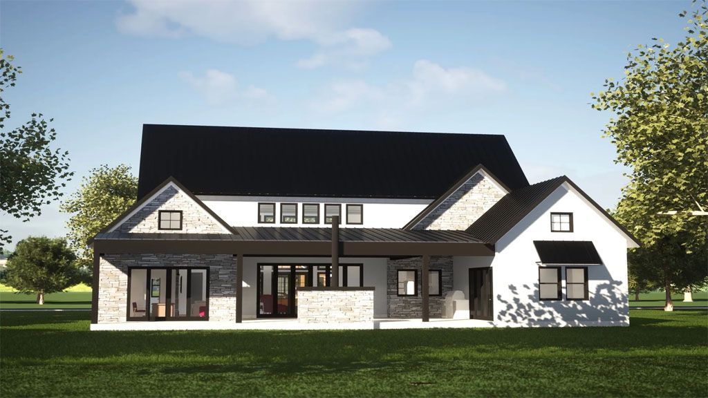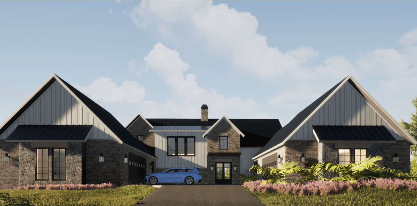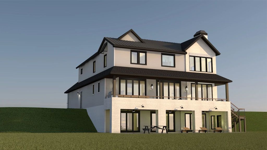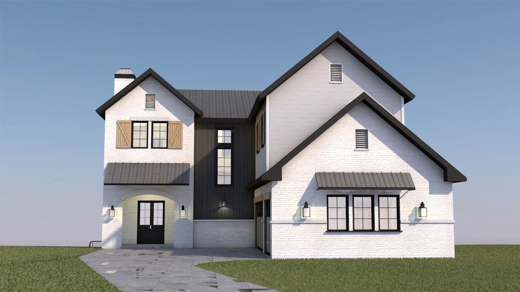 We went with white painted brick and grey stones on the Exterior, and all the framing is black. We went with a black metal roof for the roofs that give the place a modern and slick appeal. We added awnings above some of the windows as accents.