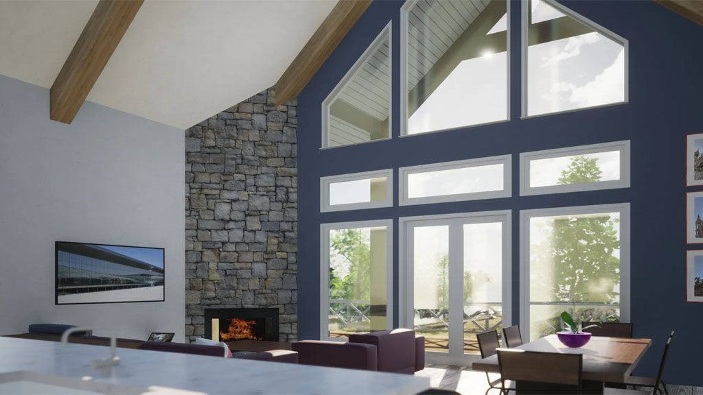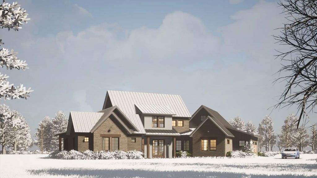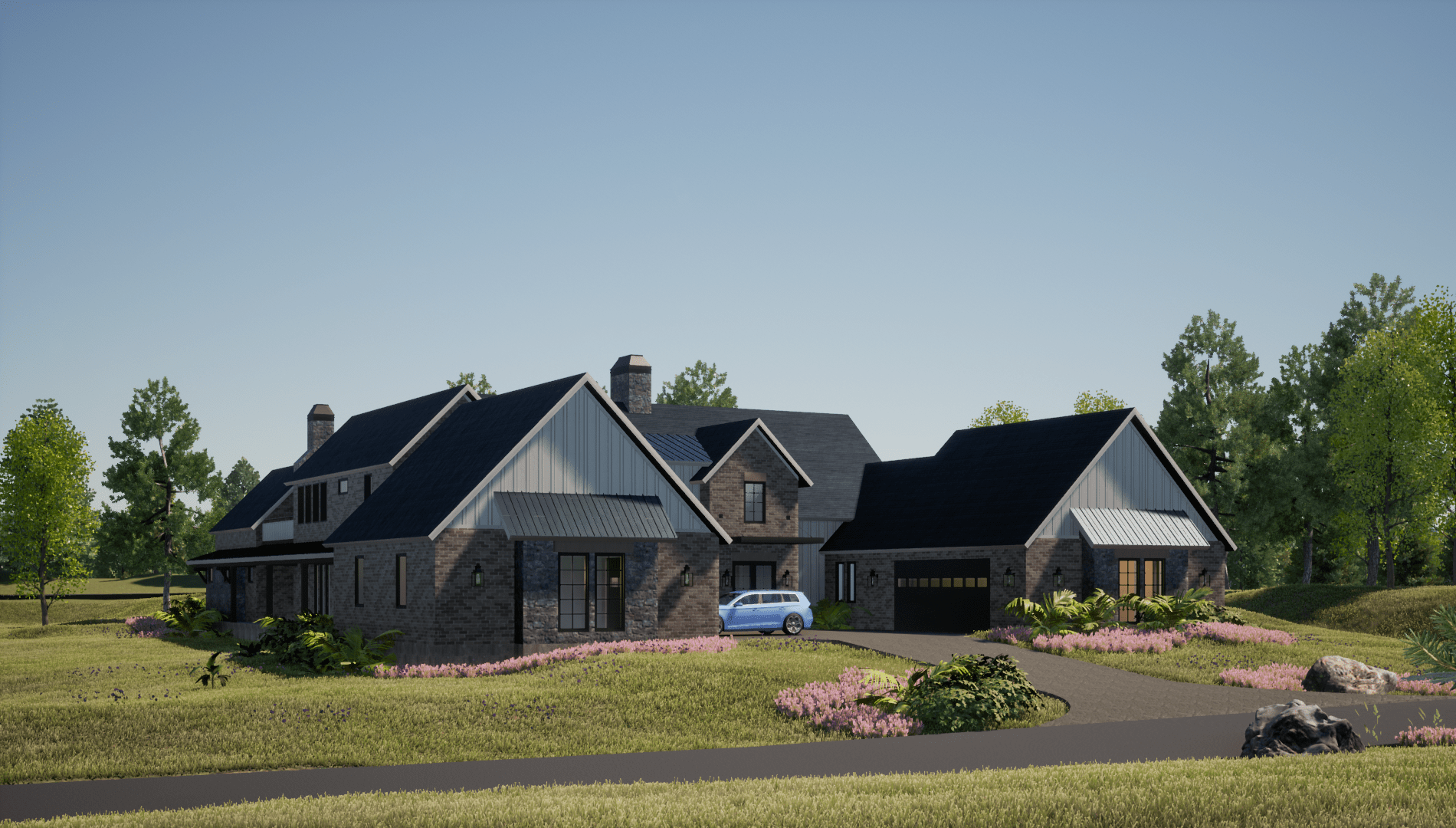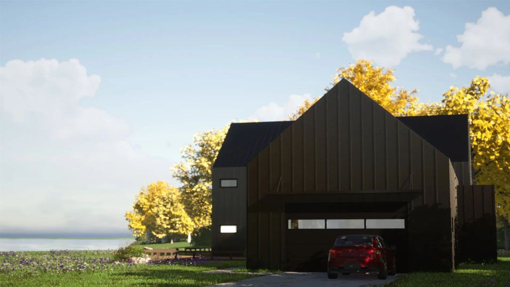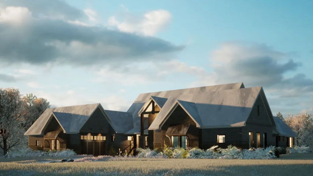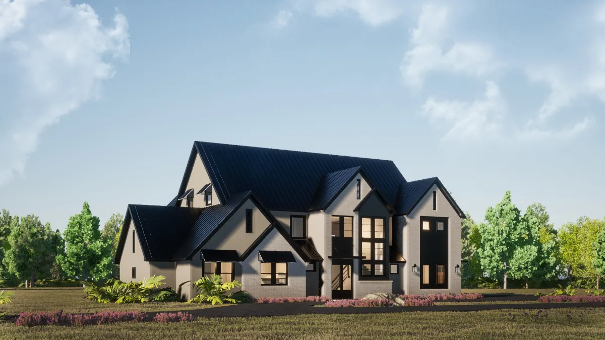 We went with white painted brick and grey stones on the Exterior, and all the framing is black. We went with a black metal roof for the roofs that give the place a modern and slick appeal. We added awnings above some of the windows as accents.