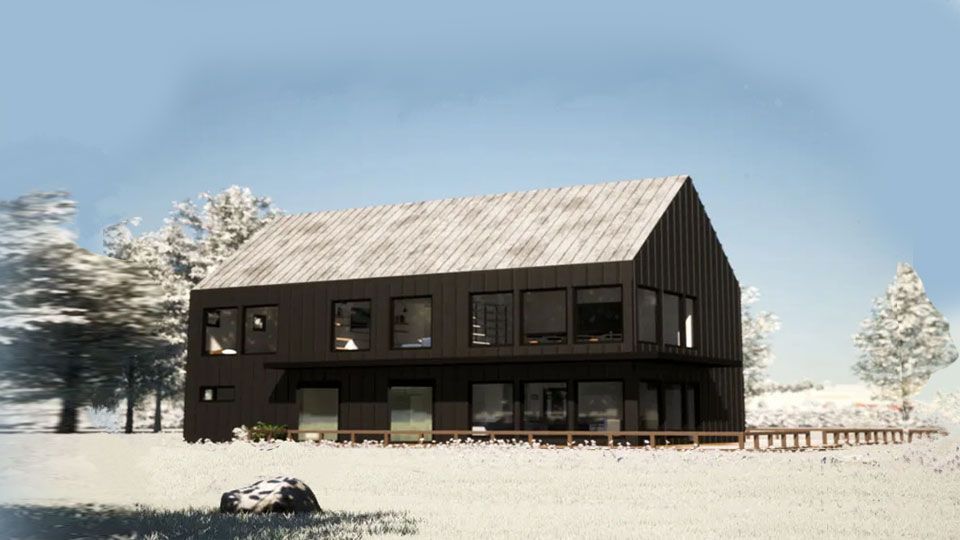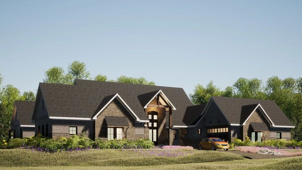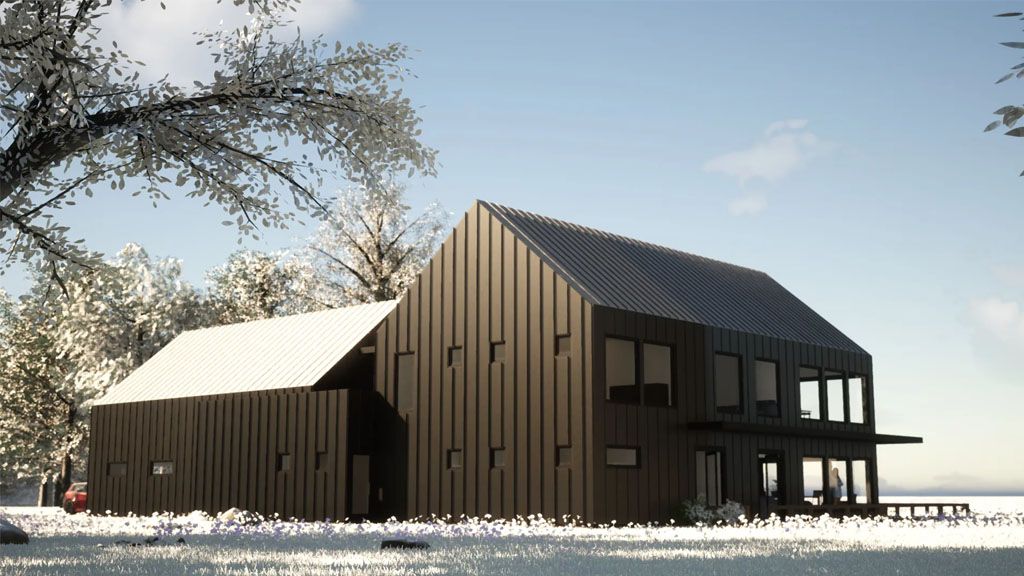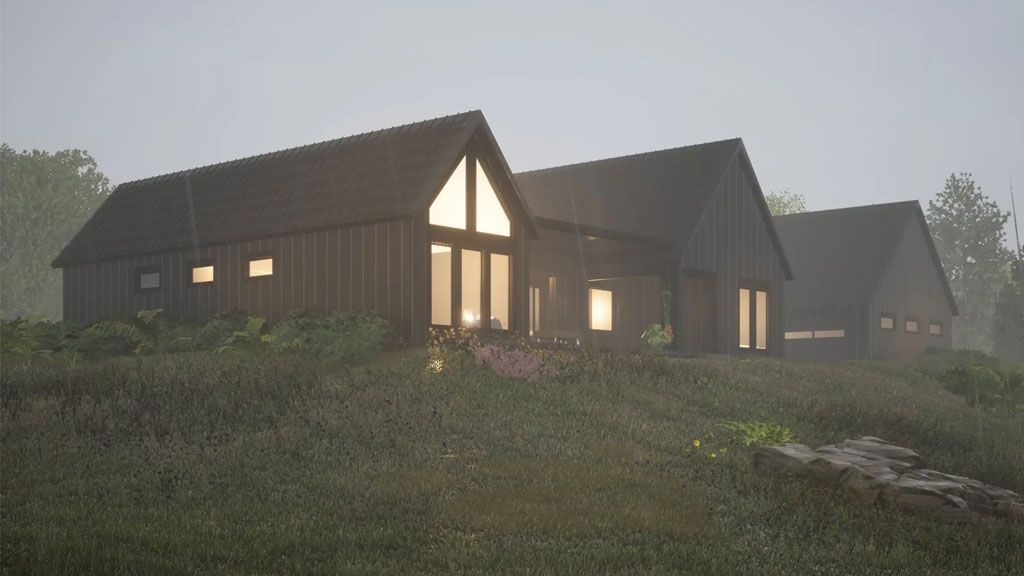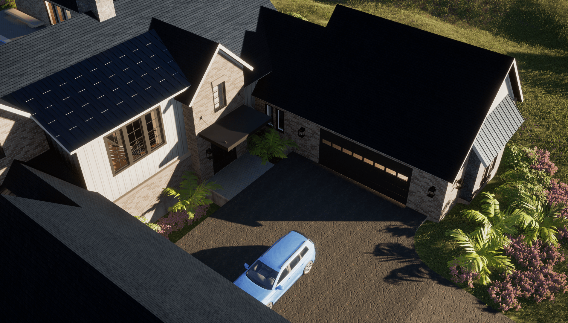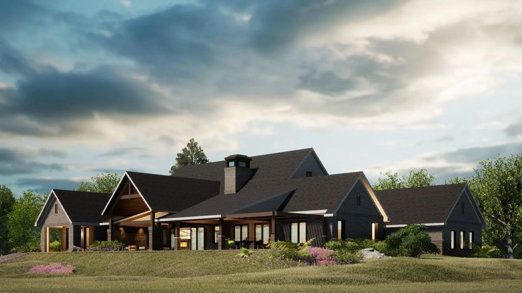 We went with white painted brick and grey stones on the Exterior, and all the framing is black. We went with a black metal roof for the roofs that give the place a modern and slick appeal. We added awnings above some of the windows as accents.
