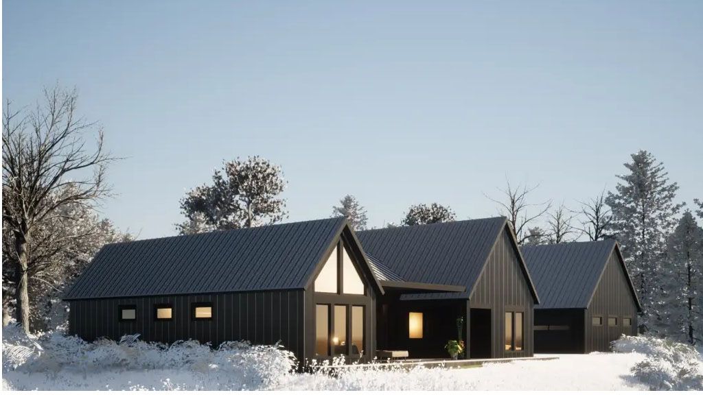 We went with black standing metal boards for the exterior walls. The framing for doors and windows is black, and the casings. The roof is also black metal-covered. All that metal serves to accomplish the Contemporary Farmhouse aesthetic we foresaw from the beginning