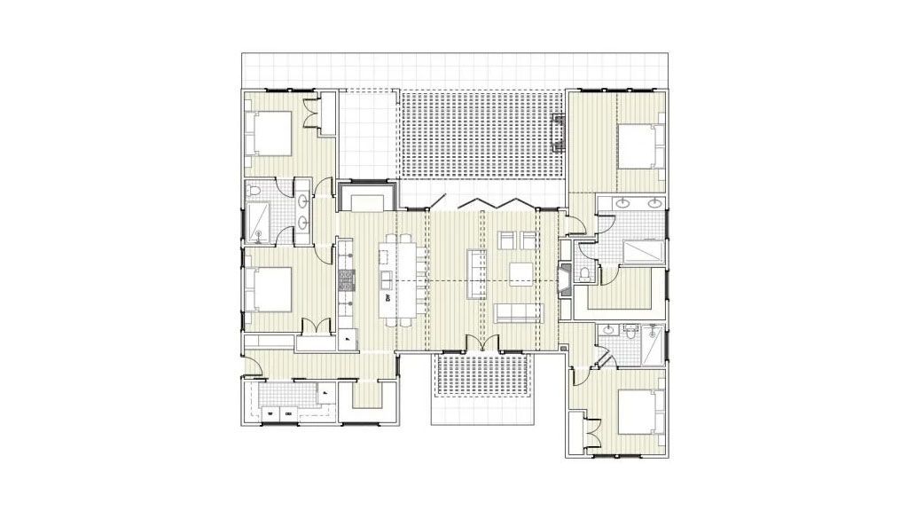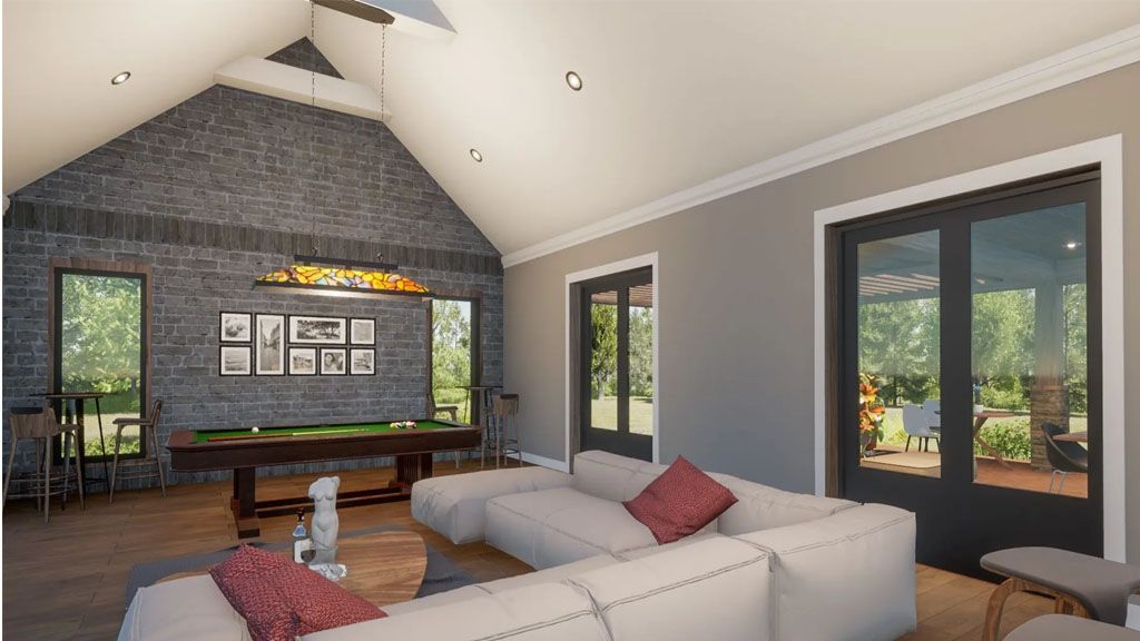 This modern farmhouse is for an entertaining retired family. It features a central gathering area as the heart of the house. In the middle of the front elevation, we find the Main Entrance covered with a Floating Pergola suspended with wires. The entrance also displays a set of windows surrounding French Doors giving the see-through effect.