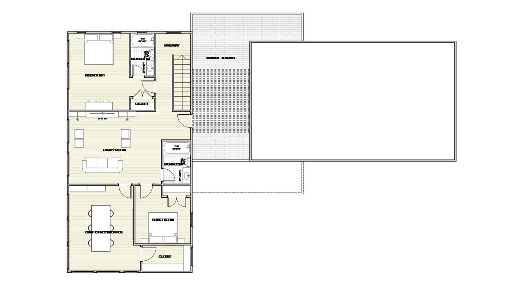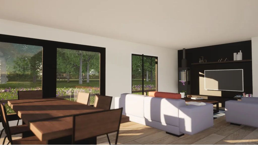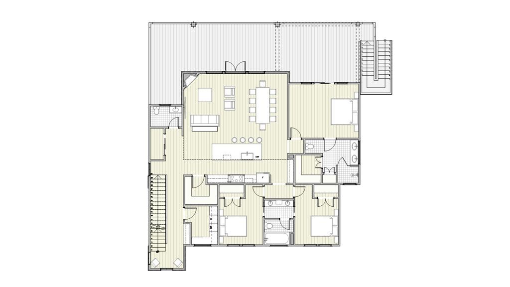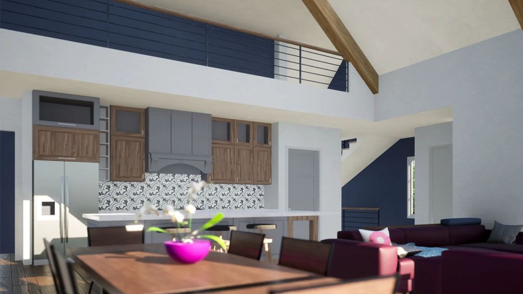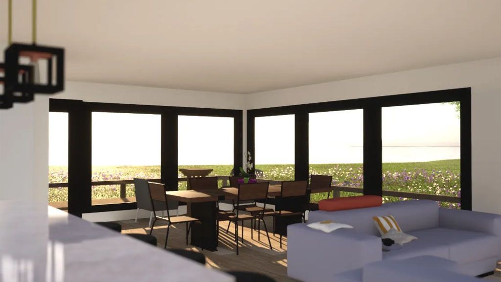The Social areas of Dining and Living room are contained in a Great Open Space full of possibilities to layout the furniture. In addition, that space focuses on a set of windows on the back wall. They look toward the patio, letting green and light in.