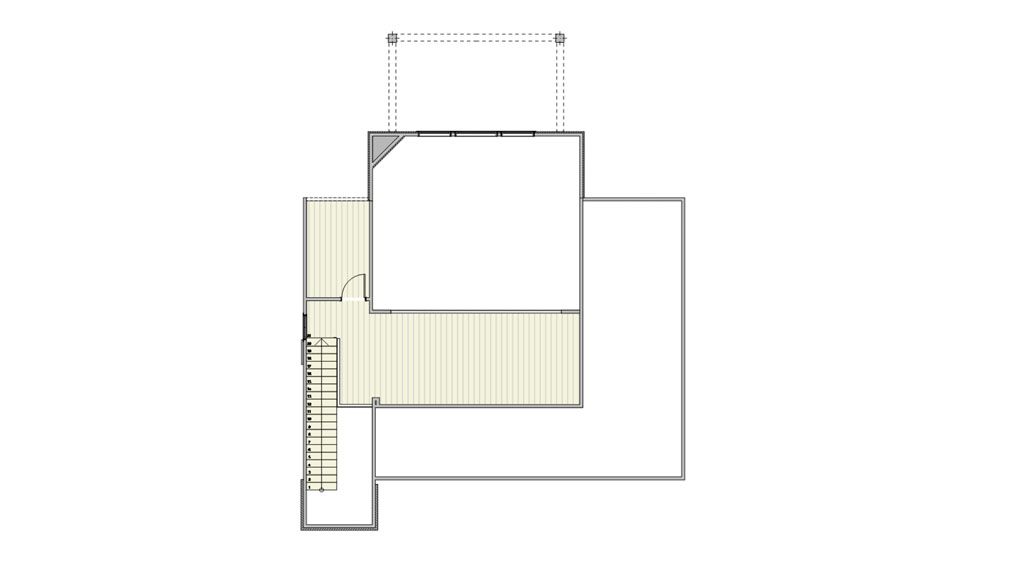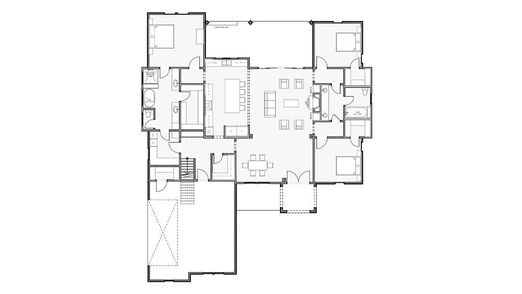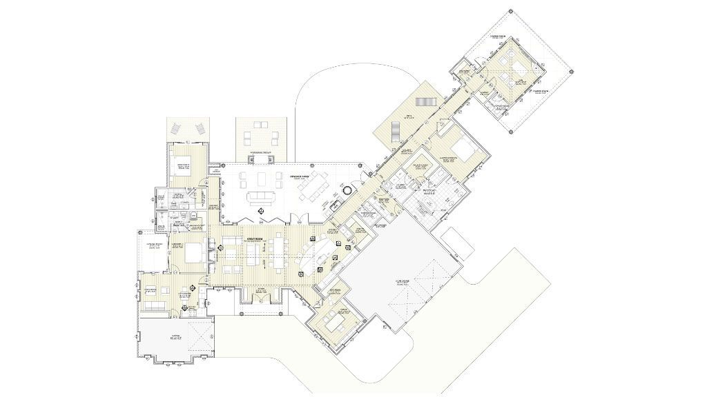 The first volume faces the street and contains the two-car garage, Utility areas, and the In-laws’ Quarters on an upper story. Perpendicular to it, we placed the principal volume, including the Family and Gathering spaces. Master Suite and Great Room are on the first floor. The bedrooms and Craft Room are on the second story. The rear of this volume is covered with floor-to-ceiling windows that make it possible to stare at the lake from every room.