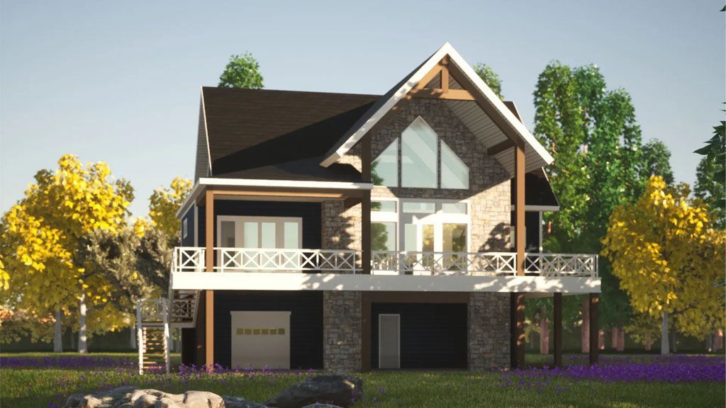 On the ground level, replaced the Garage, Storage, and the Foyer. ON the Main floor, the Great Room is a High Vaulted Ceiling decorated with wood beams. That high space also opens up the lake view with a glass wall that displays french doors in the center, leading to a Large Rear Deck for outdoor activities.