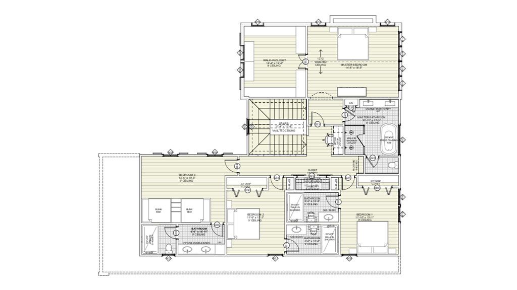 The upper level holds the rooms and features an office nook. At this level, we have the Master Bedroom, a gorgeous Master Bathroom, two Secondary Bedrooms, and a Bunk Bedroom.