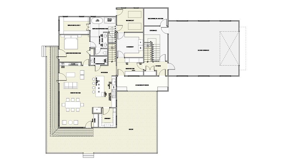 There is access from the Kitchen to the Master Suite, connecting to the Laundry Room. This house has Two Car Garage with a side entrance. It also has enough room for a Workshop and presents a Storage space. Coming in from the garage, you get to the Mudroom, the Walk-in Pantry, The Laundry, and the stairs going up to the Attic.