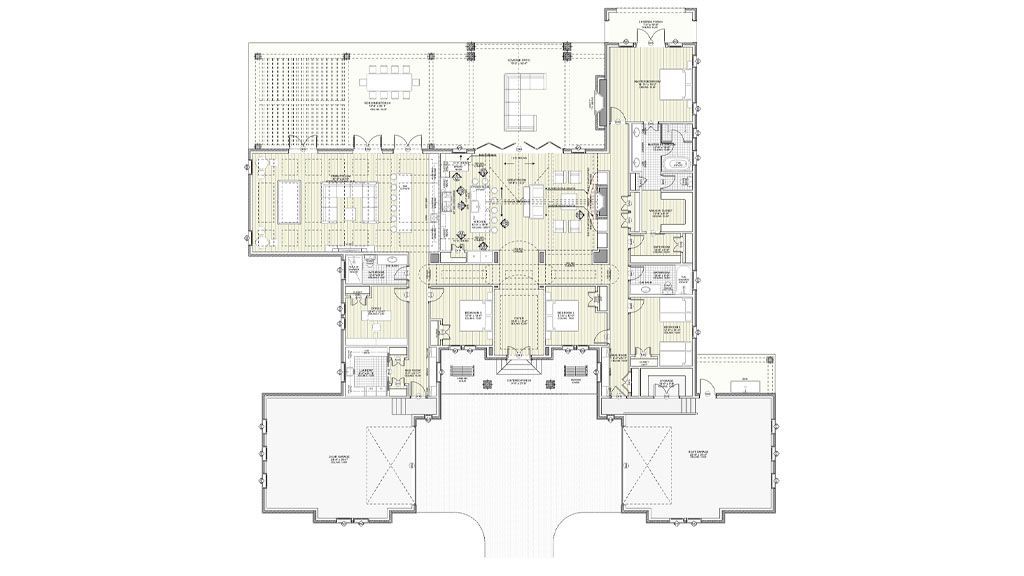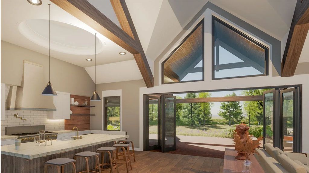 The Great Room displays accordion doors that allow us to connect the indoor and outdoor spaces seamlessly. Then we can turn it all into a single ample space at any given time when family and guests arrive. The Covered Patio has access from the great room, the Master Bedroom, and the Studio. It has an Outdoor Cooking station and an Outdoor living area with a fireplace.