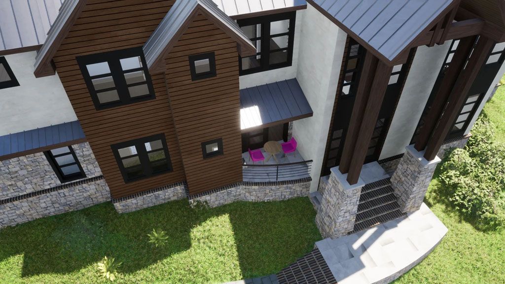 We combined tan stucco, stone, and reclaimed stained wood as accents. Also, we added dark metal roofs as a crown to the whole design. Stained wood shiplap is also showcased on every gable we created around the house.