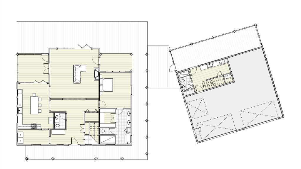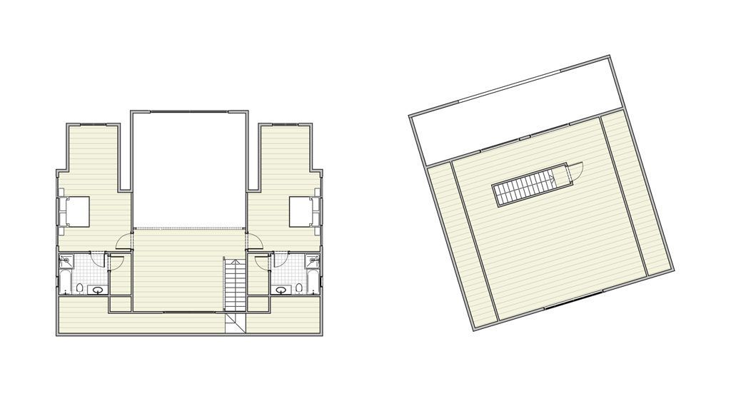 Coming up the stairs, you get to a catwalk overlooking the Great Space on the main level. That Catwalk wraps around the Great Room Below. It features the Bedrooms on one end and the Studio with the Upper Deck on the other end.