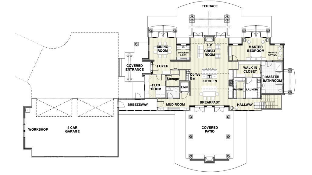 The House shows an extended Front Covered Porch. A door flanked by brick bump-outs that define the Main Entrance. Beyond that door, you get directly into a Great Open Space with the Living Room, Dining Space, and the Kitchen, open to the rear views. Next to the Kitchen, you will find a long hallway leading you to the Secondary Bedrooms, Guest Suite, and the Utility Room.