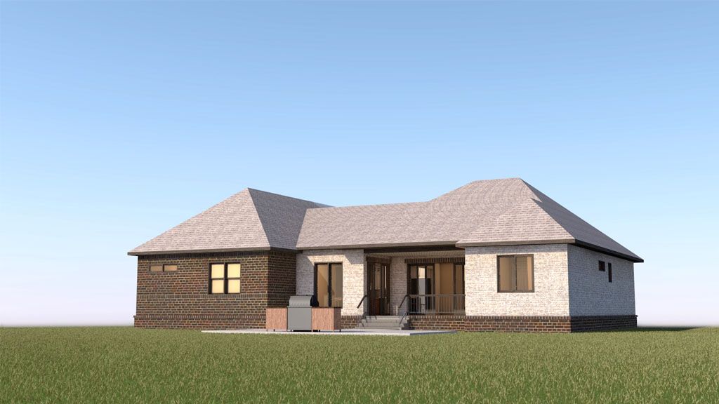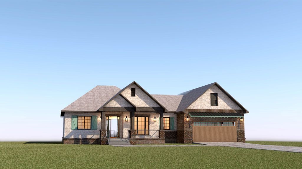 This house displays a cozy Covered Porch crowned by a Dormer on the front. Tall windows and columns frame emphasizes the Main Entrance. That covered entrance leads directly into a Great Room that holds the Living and Dining space and Kitchen. After the Great Room, you find a hallway leading you to the Master Suite and the Secondary Bedrooms.