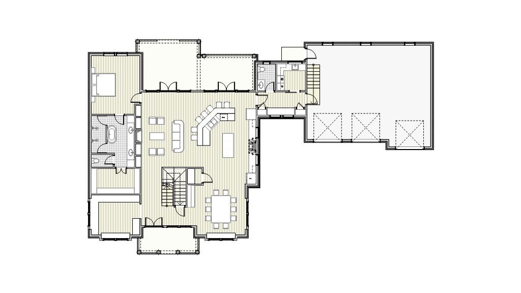 The Great Open Space contains the Living Room and The Kitchen, connected to the formal Dining Room. The Kitchen shows two islands, and it is open to the great room and the Dining Room. Behind the Kitchen is a Hiden office with space enough for two people.